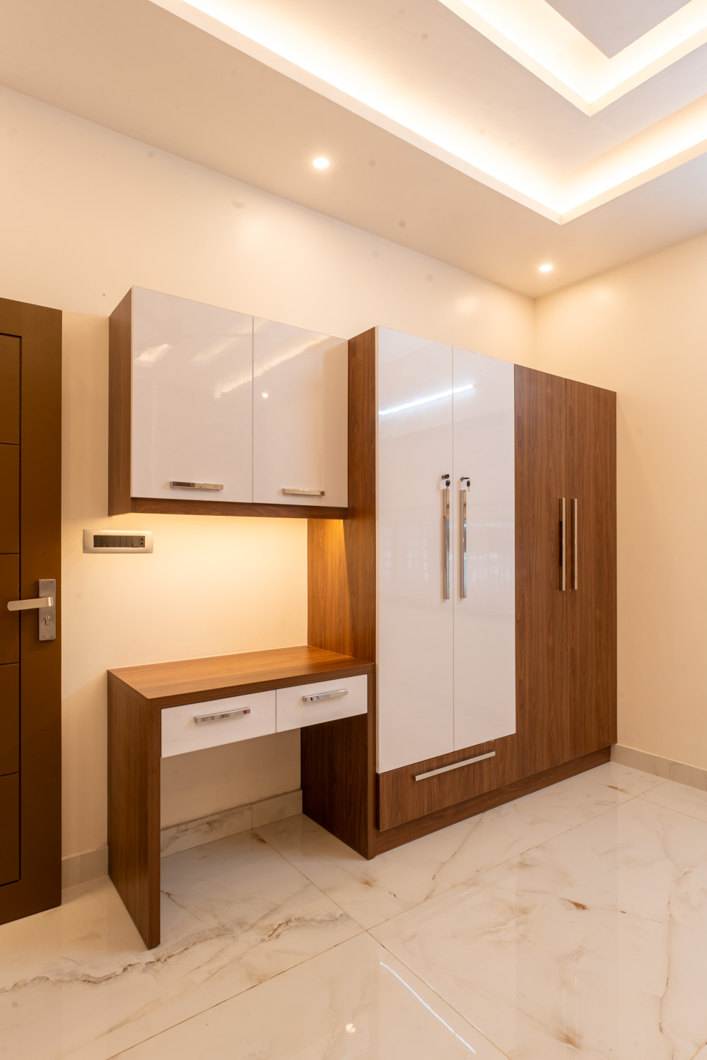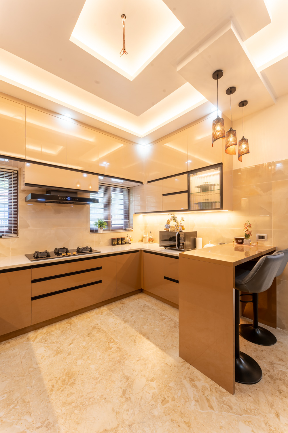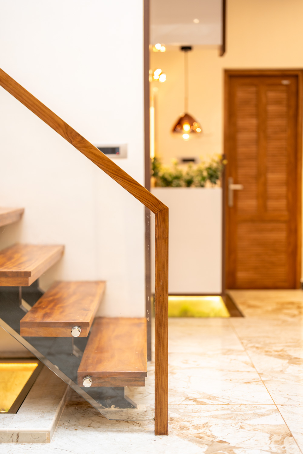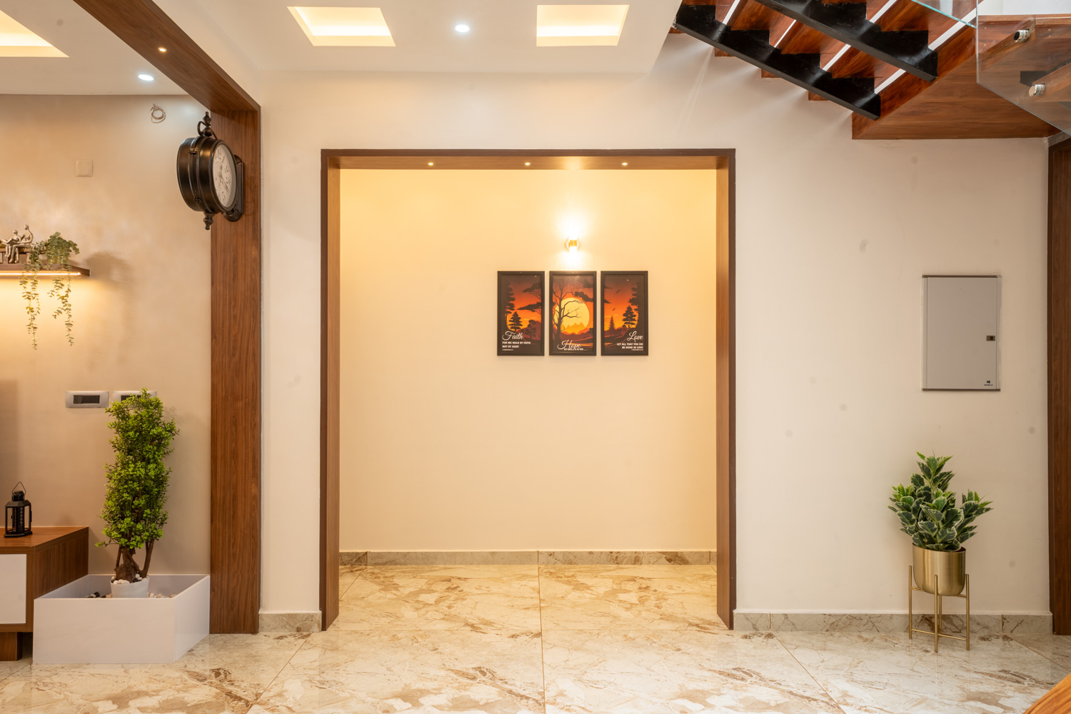 For this home, we embraced a contemporary aesthetic with clean lines, rich textures, and layered lighting. The living area features a combination of elegant ceiling design, high-gloss marble flooring, and a statement staircase with glass railing — all harmonized with curated furniture pieces in bold, luxurious tones.