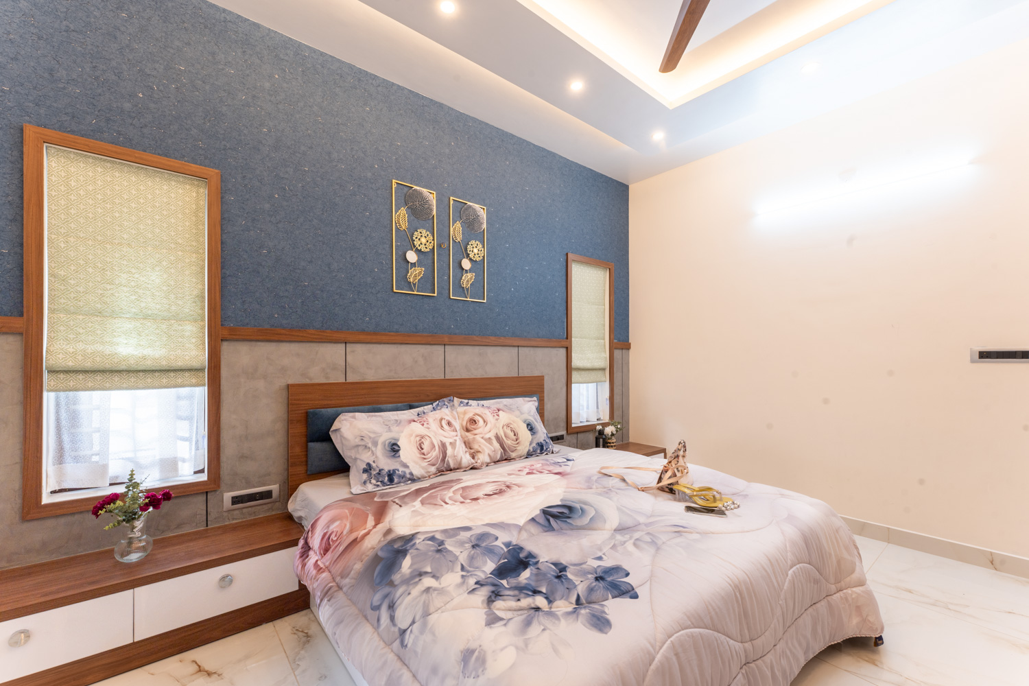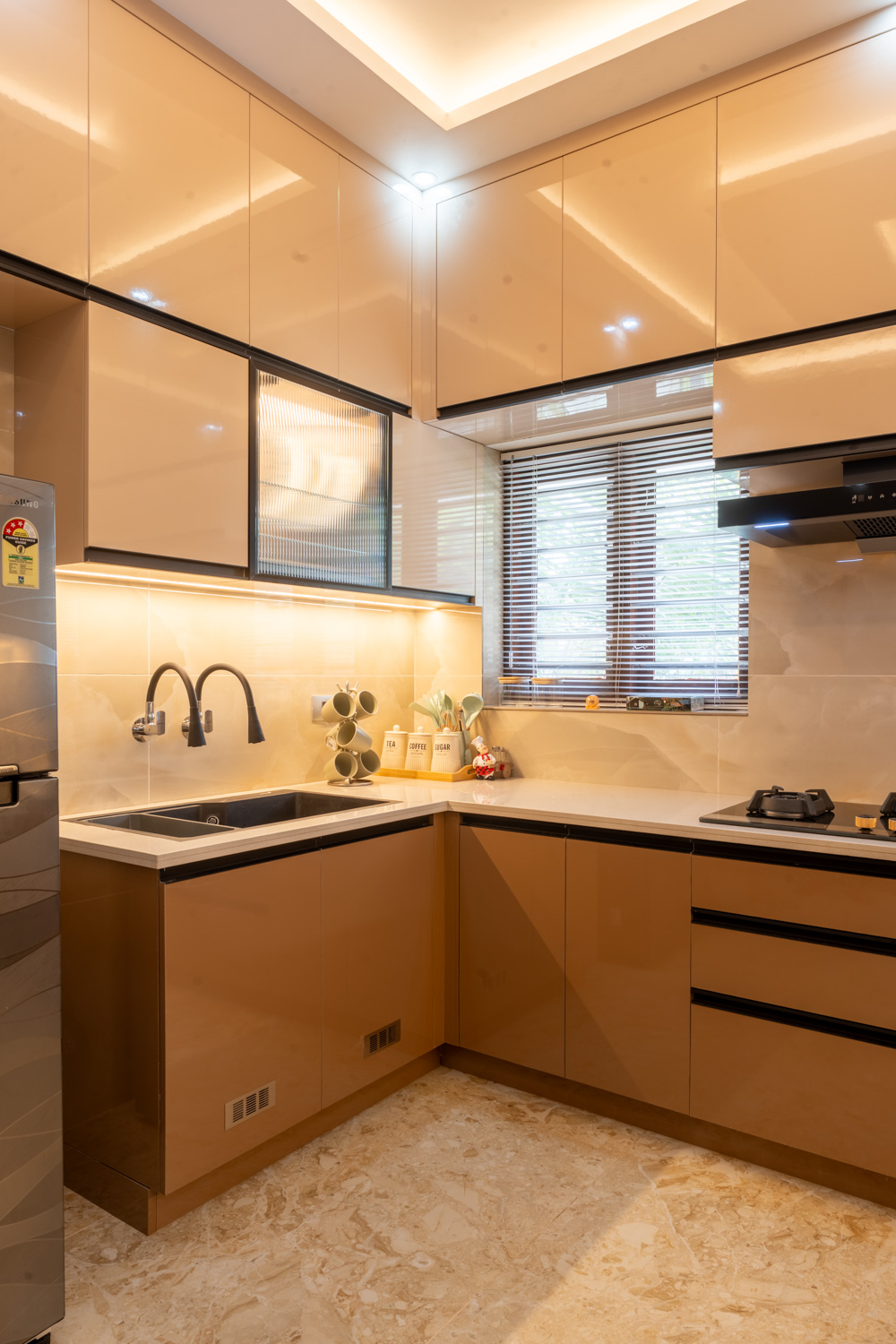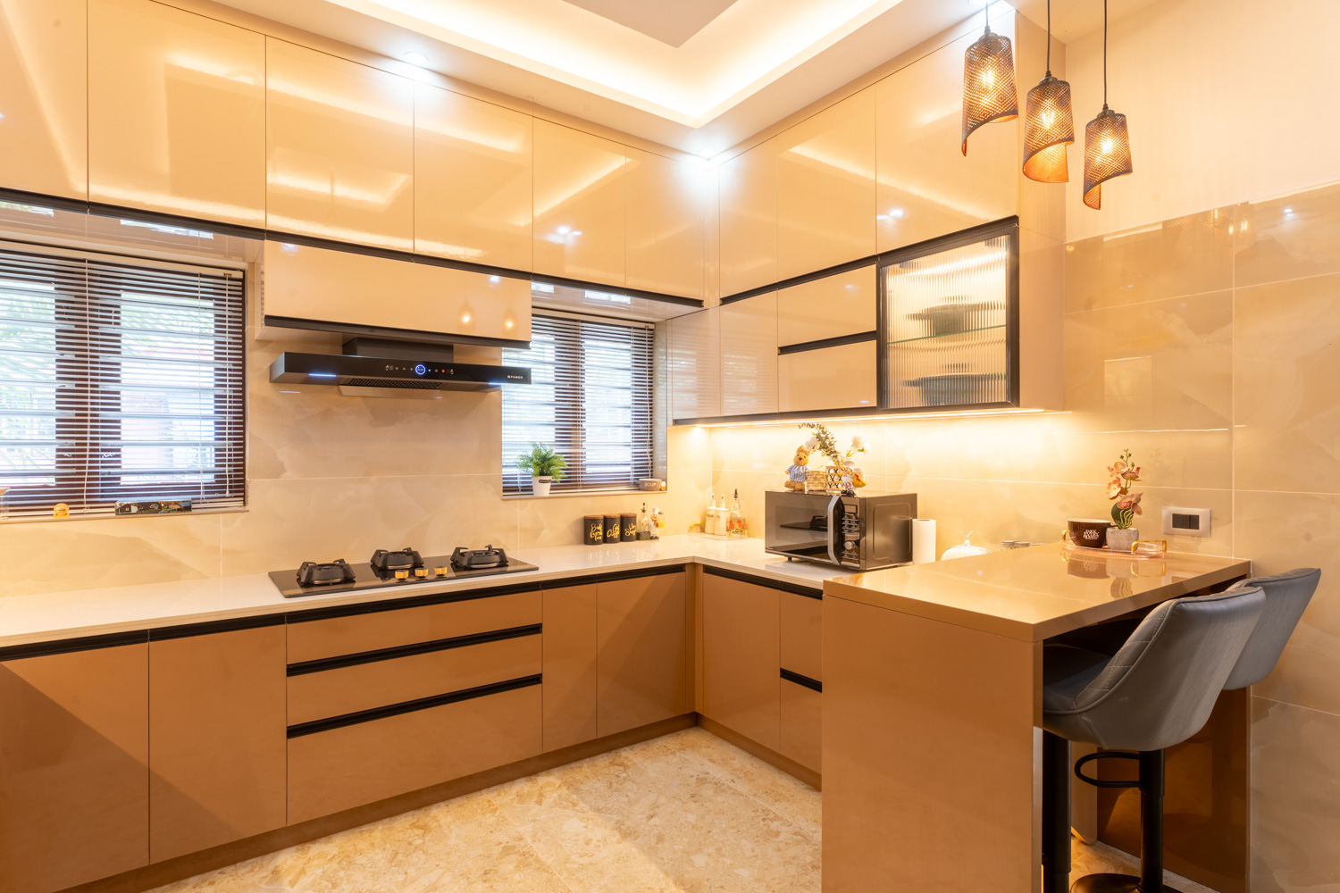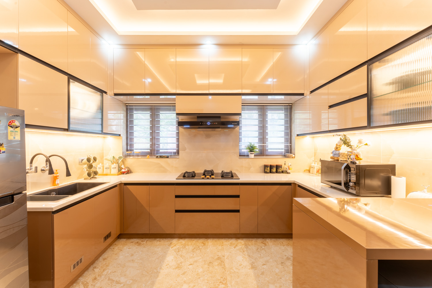 For this home, we embraced a contemporary aesthetic with clean lines, rich textures, and layered lighting. The living area features a combination of elegant ceiling design, high-gloss marble flooring, and a statement staircase with glass railing — all harmonized with curated furniture pieces in bold, luxurious tones.