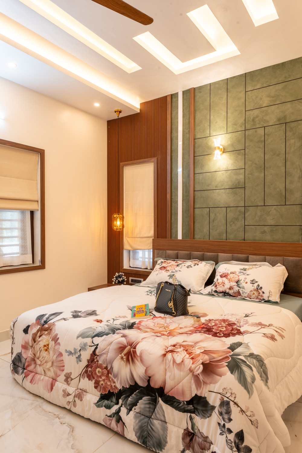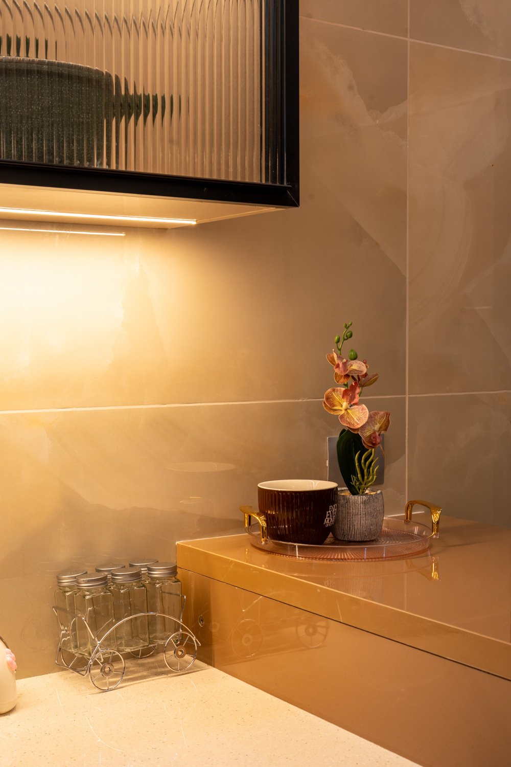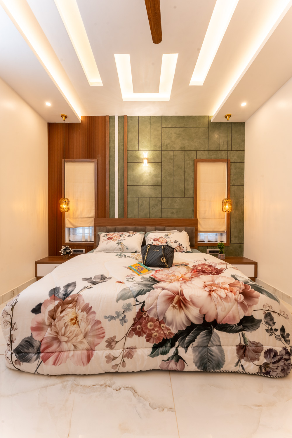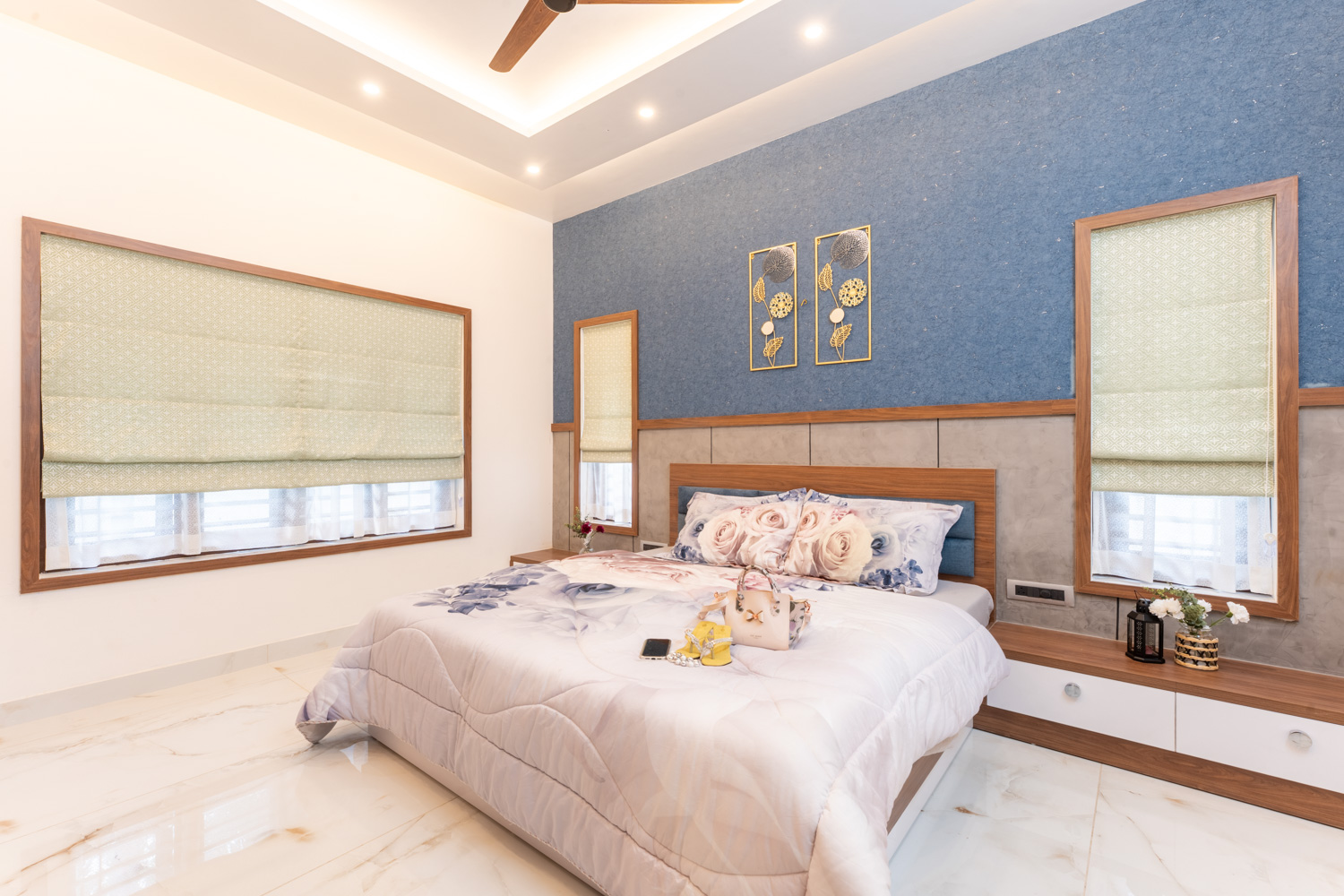 For this home, we embraced a contemporary aesthetic with clean lines, rich textures, and layered lighting. The living area features a combination of elegant ceiling design, high-gloss marble flooring, and a statement staircase with glass railing — all harmonized with curated furniture pieces in bold, luxurious tones.
